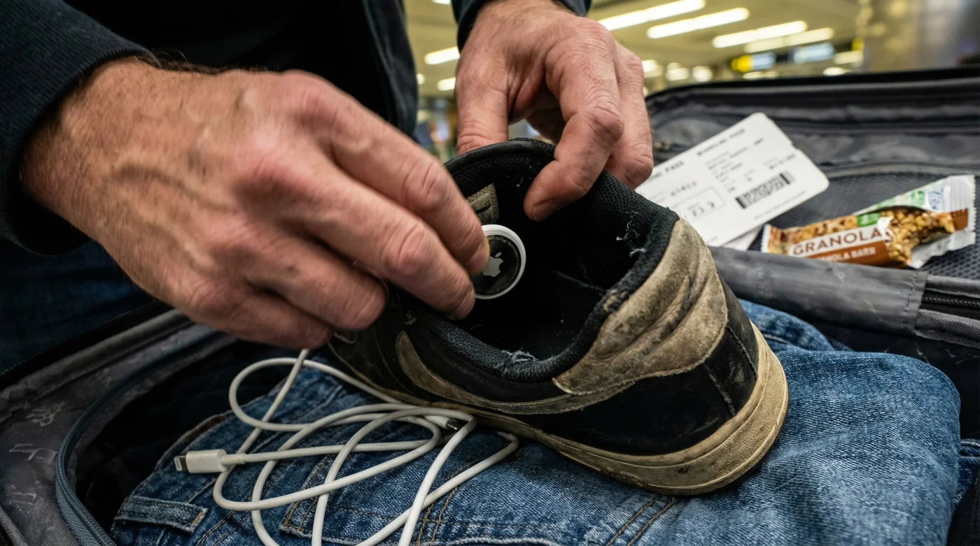 Instead of the outer shell, bury the Apple AirTag deep inside the toe box of a packed sneaker or boot located in the dead centre of your luggage. Push the device exactly 4 to 6 inches deep into the footwear, and stuff a single pair of rolled cotton socks behind it. This accomplishes three critical things. First, it completely hides the tracker from a visual sweep. A thief rushing to steal electronics will rarely inspect the inside of a worn running shoe. Second, the thick rubber sole of the shoe protects the device from blunt force trauma during aggressive baggage loading. Finally, the breathable fabric of the footwear allows the Radio Frequency waves to escape without the heavy interference caused by being pressed against dense metallic objects like laptops or grooming clippers.